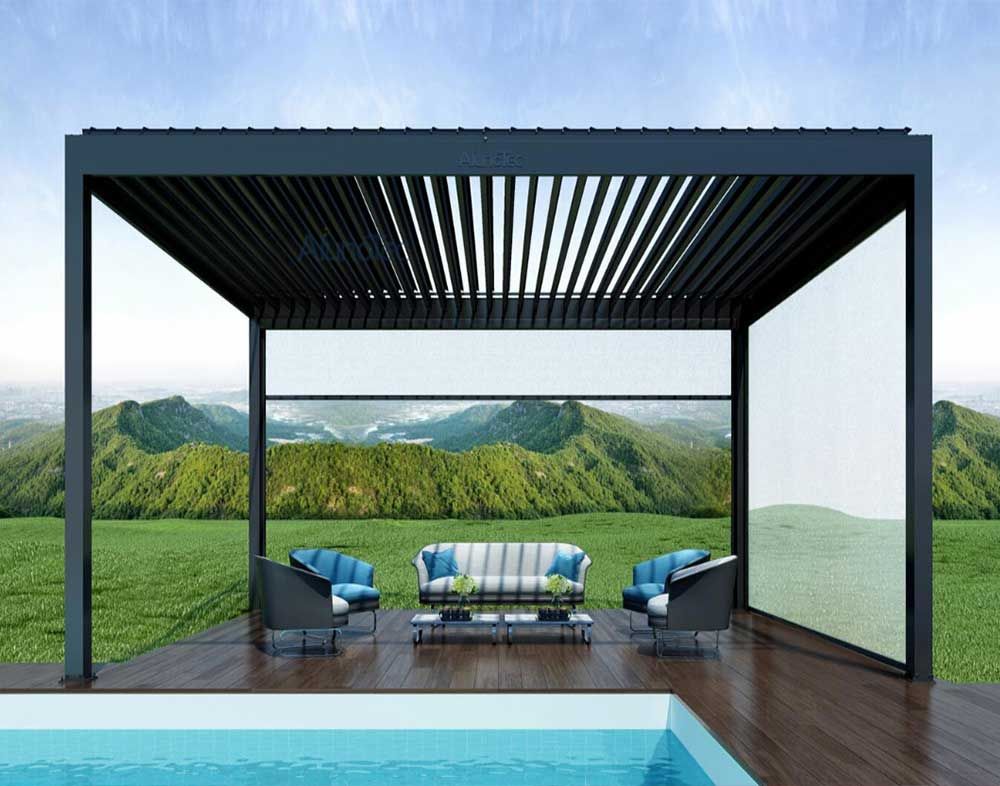 En la pérgola de lamas retactables, la cubierta, además del Hecho de que se puede plegar, está formada por lamas rotativas